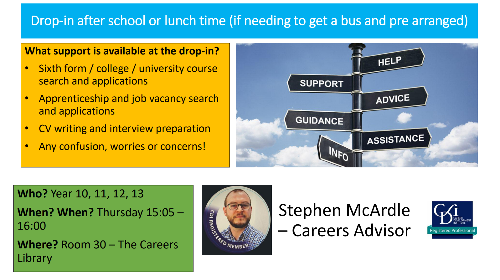 Any students in Year 7 to 11 who would like to book an appointment can see Mrs Adams (Careers Lead)