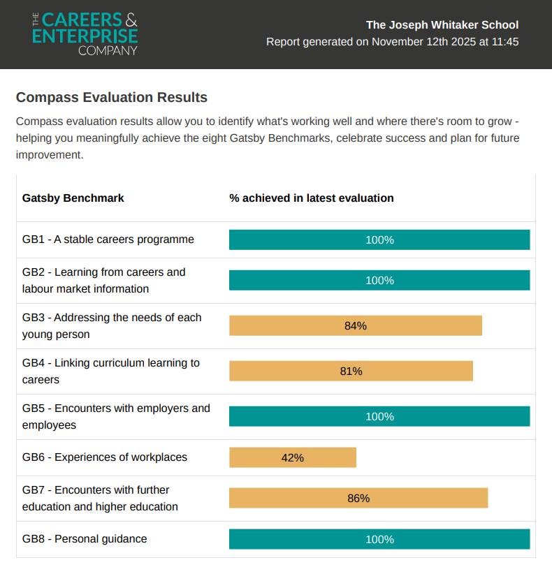 Below you can see our most up to date Compass Plus evaluation which shows the progress we make each term towards the 8 Gatsby Benchmarks.