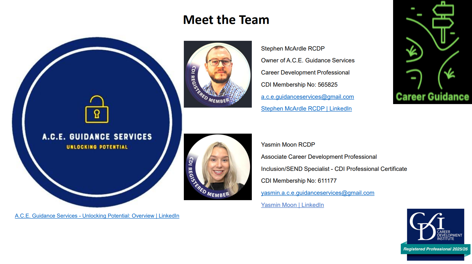 All students in Year 10 have a 1:1 Careers Meeting in school with either Steve or Yasmin from A.C.E Guidance Services, both are Leve 6 qualified, independent careers advisors. This is a high quality, nationally recognised professional qualification and is the sector’s standard for career development professionals. As members of the Career Development Institute (CDI), they work in accordance with the CDI’s Code of Ethics. As a Registered Career Development Professional (RCDP), they are required to update knowledge and practice through annual continued professional development activities.