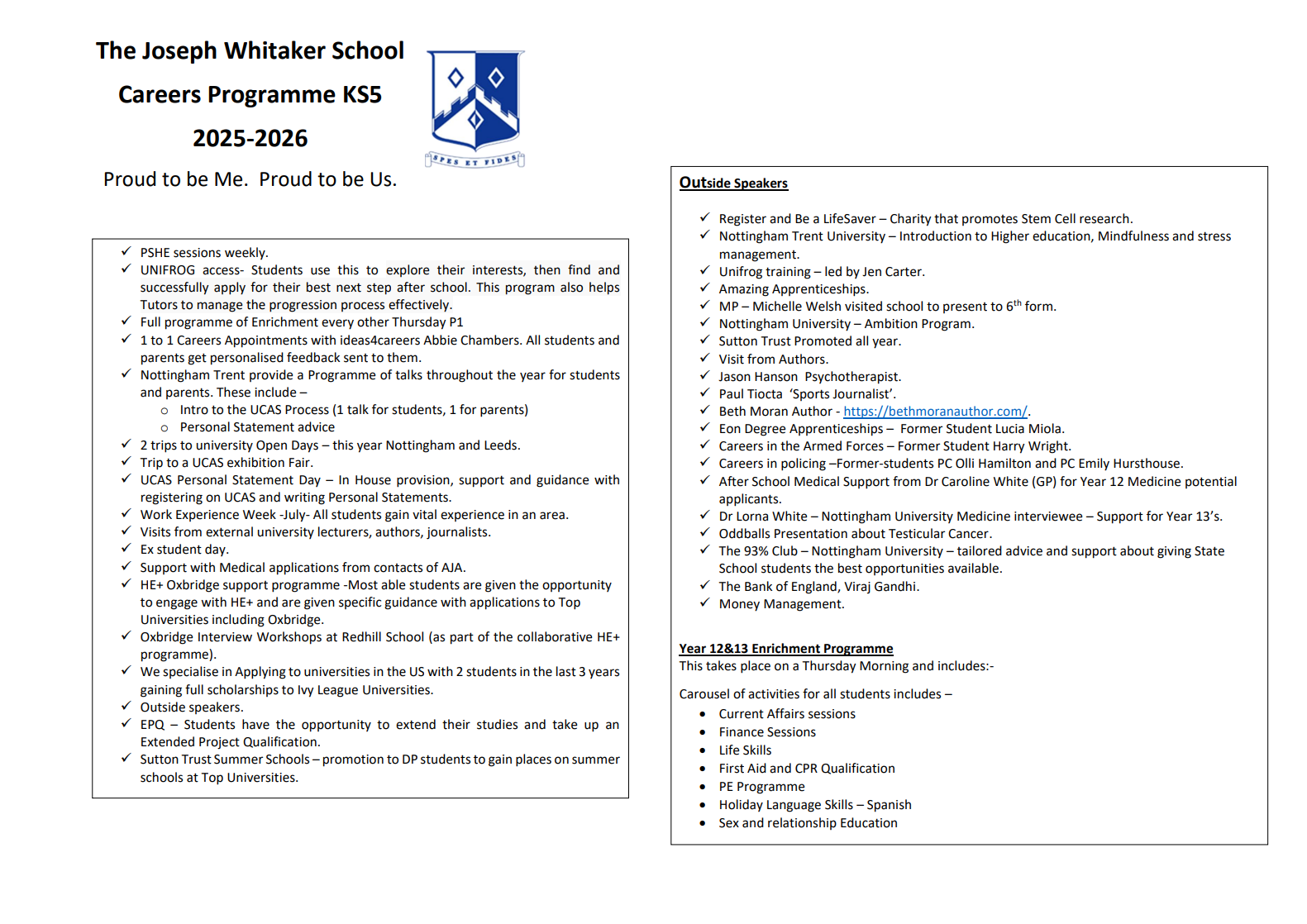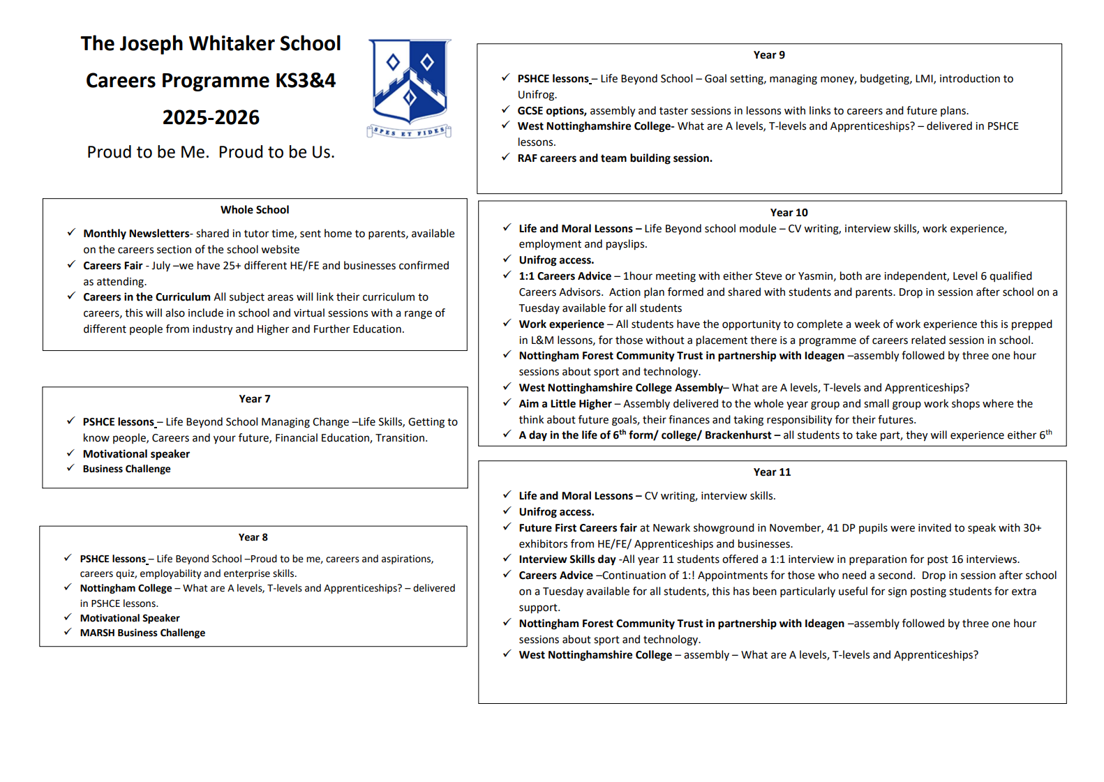 Careers education, information and guidance (CEIAG) makes a major contribution to preparing young people for the opportunities, responsibilities and experiences of life. At The Joseph Whitaker School we are very proud of our planned programme of activities which enable our students to gain the knowledge and skills needed to make informed choices. manage transitions, and plan their career path.